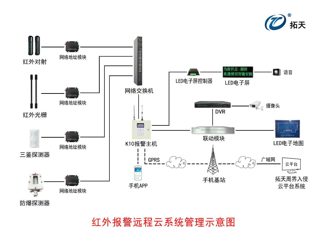 可與周界報(bào)警設備(bèi) GPRS報(bào)警主機通過手機卡連廣域網雲服務器